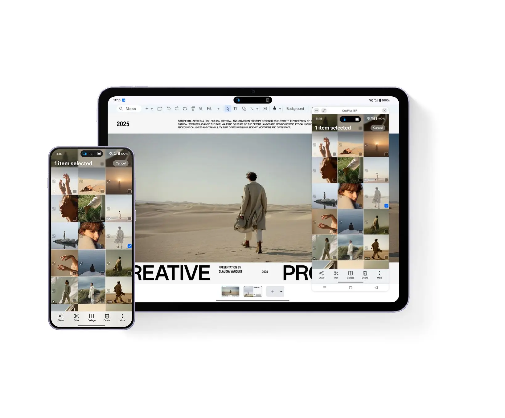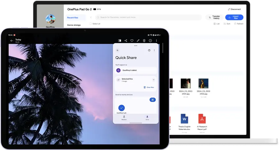 Два экрана. Одно рабочее пространство. Никаких сложностей. Перетаскивайте файлы, фотографии и видео между телефоном и планшетом OnePlus.
